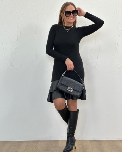 • Kadın uzun kollu bisiklet yaka üst viskon etek ucu deri kısa elbise