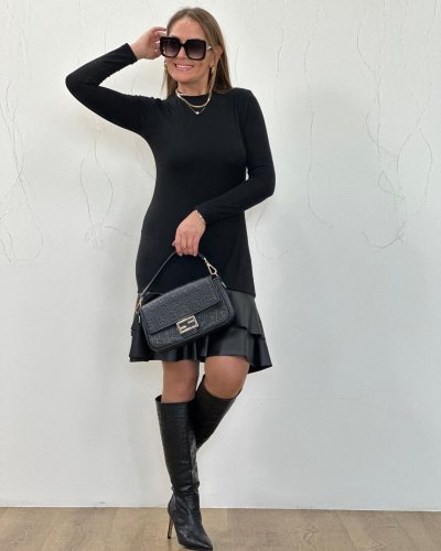 Kadın uzun kollu bisiklet yaka üst viskon etek ucu deri kısa elbise