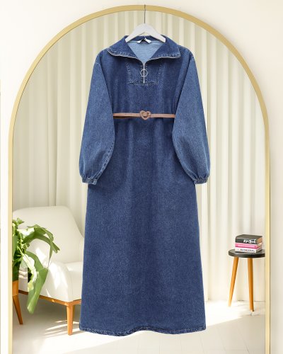 • Yarım Boğazlı Fermuarlı Cepli Kot Elbise İndigo