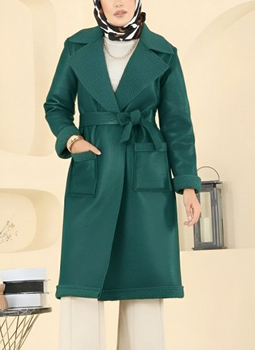 • Beli Kemerli Çift Cepli İçi Kürklü Deri Kaban Zümrüt