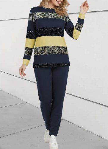 • Kadın uzun kollu bisiklet yaka çizgili desen iki iplik bluz ve pantolon ikili takım